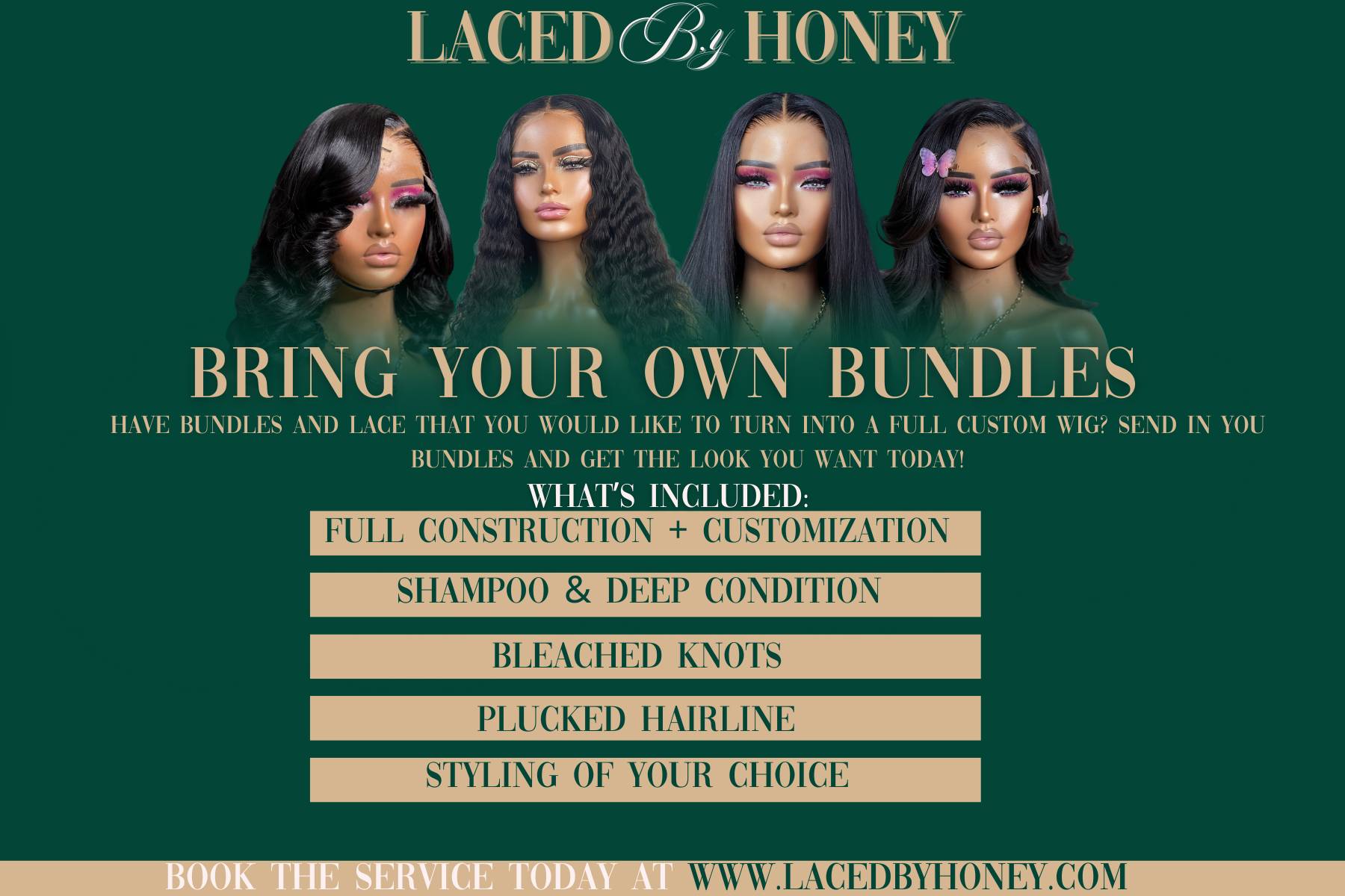 Do you have bundles that you would like to be made into a full wig and fully customized? Look no further! Send in your bundles to be made into a wig by us. Bring Your Own Bundles means you will supply Laced By Honey with bundles and closures you have purchased and sent in to be fully customized. Your wig will come fully customized and ready to wear right out the package!
